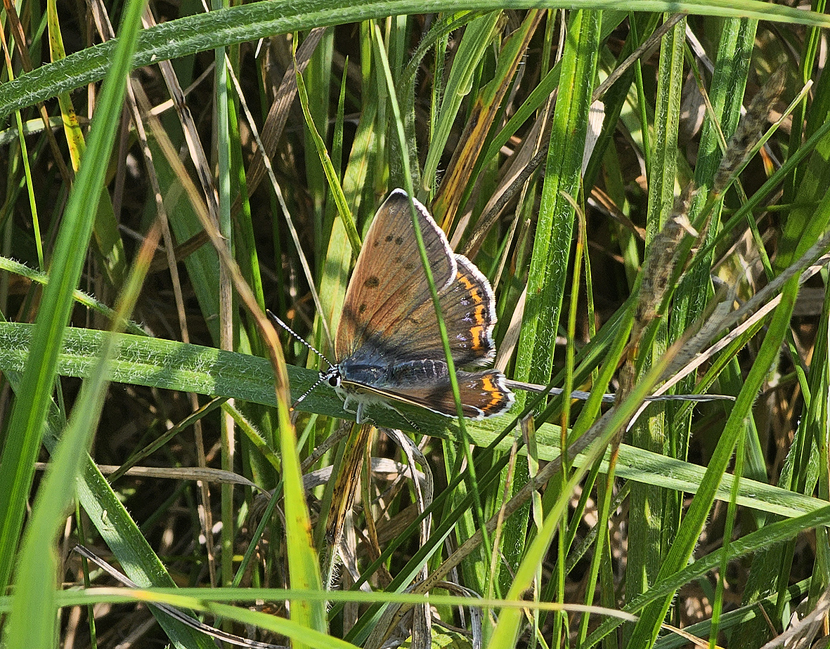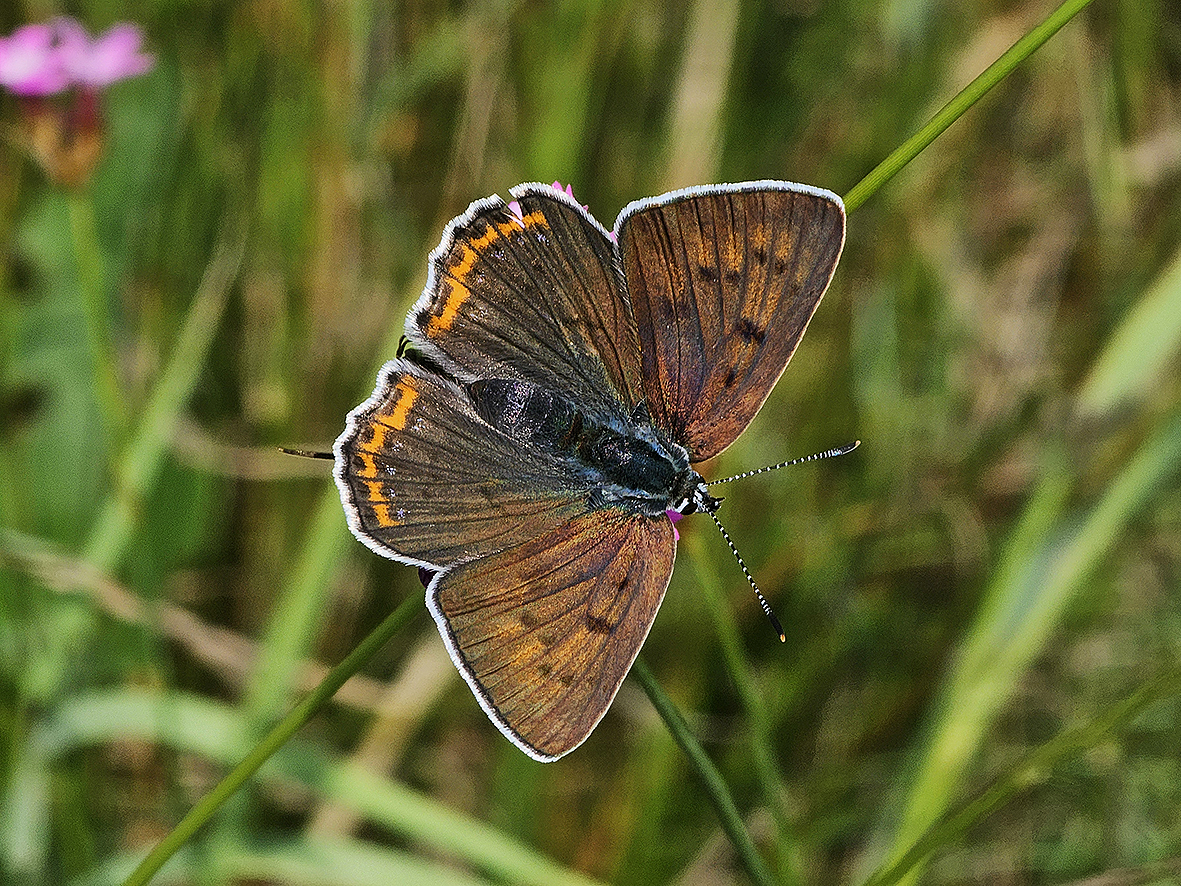 Biológia motýľa: Je to plachý motýľ, ktorého možno vidieť ako krikľavo oranžový záblesk, ktorý preletuje ponad lúkami. Motýle sa radi slnia s rozprestretými krídlami sediac na listoch tráv a bylín. Tiež sajú na najrôznejších lúčnych kvetoch. Samička kladie vajíčka len za plného slnečného svitu. Umiestňuje ich na listy alebo stonky živných rastlín. Vyberá si najmä malé a mladé rastlinky rastúce solitérne medzi kameňmi alebo v odkrytej pôde.